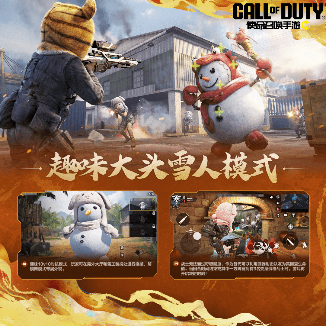 来自打雪仗的快乐,属于童真的狂欢,多人对战-限时-雪人大作战模式将于11月19日(本周三)返场。在该模式中,战士们将体验10V10畅爽激战,积累能量,变身雪人,更有丰富外观等待解锁,快来体验吧!