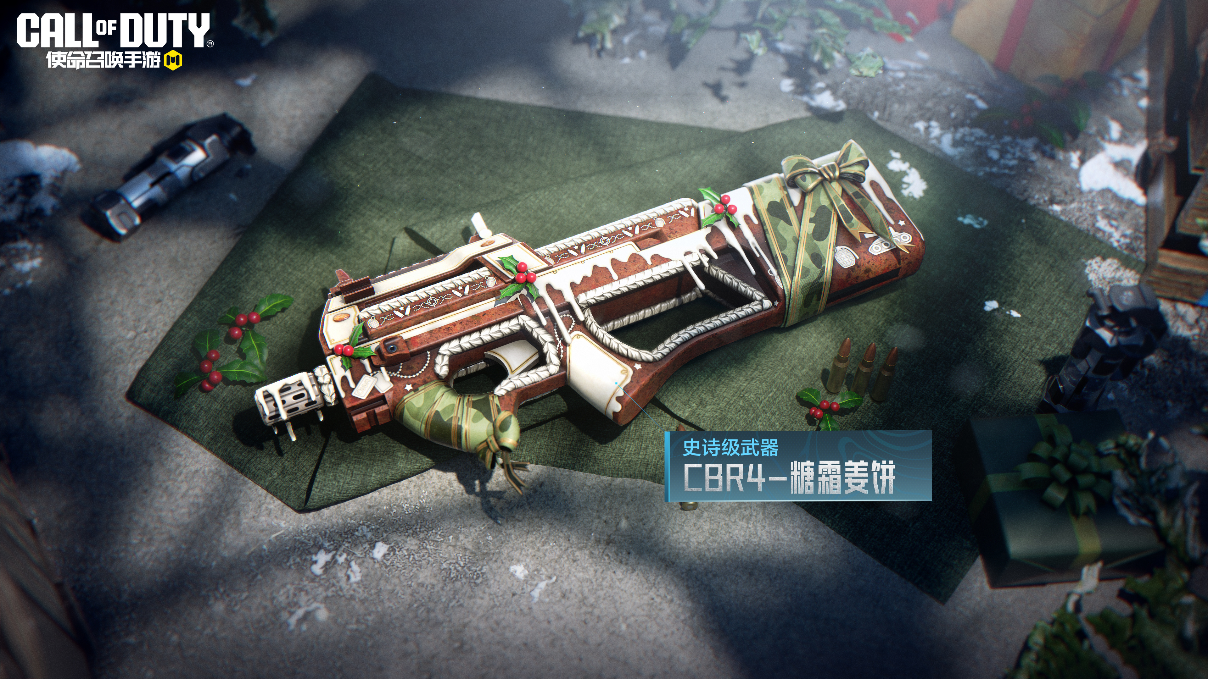 CBR4-糖霜姜饼被设计成一块巨大的姜饼,表面装饰有白色的糖霜,红色的浆果以及绿色的叶子。这把武器还系着一条迷彩丝带,像是一个精心装点后的礼物。