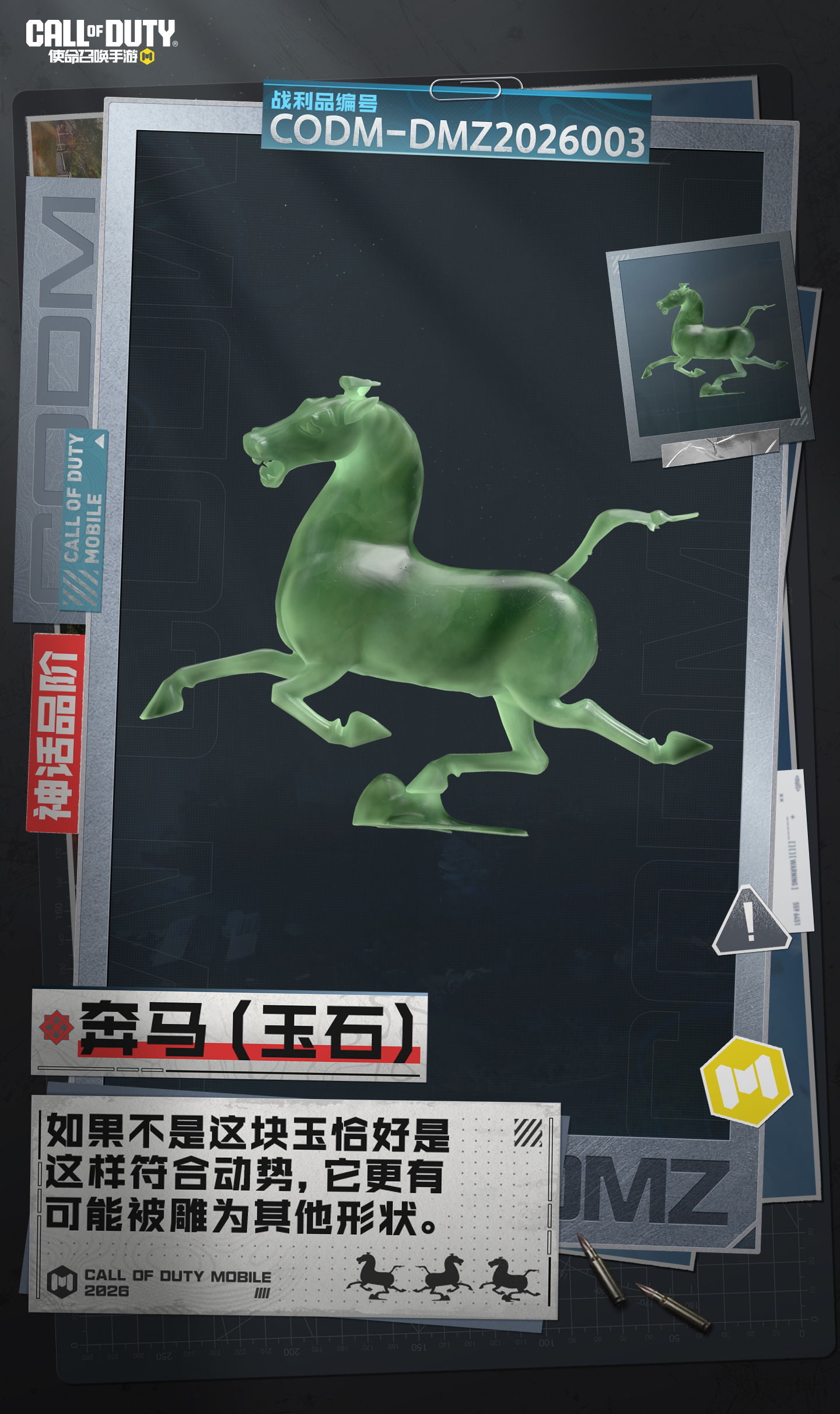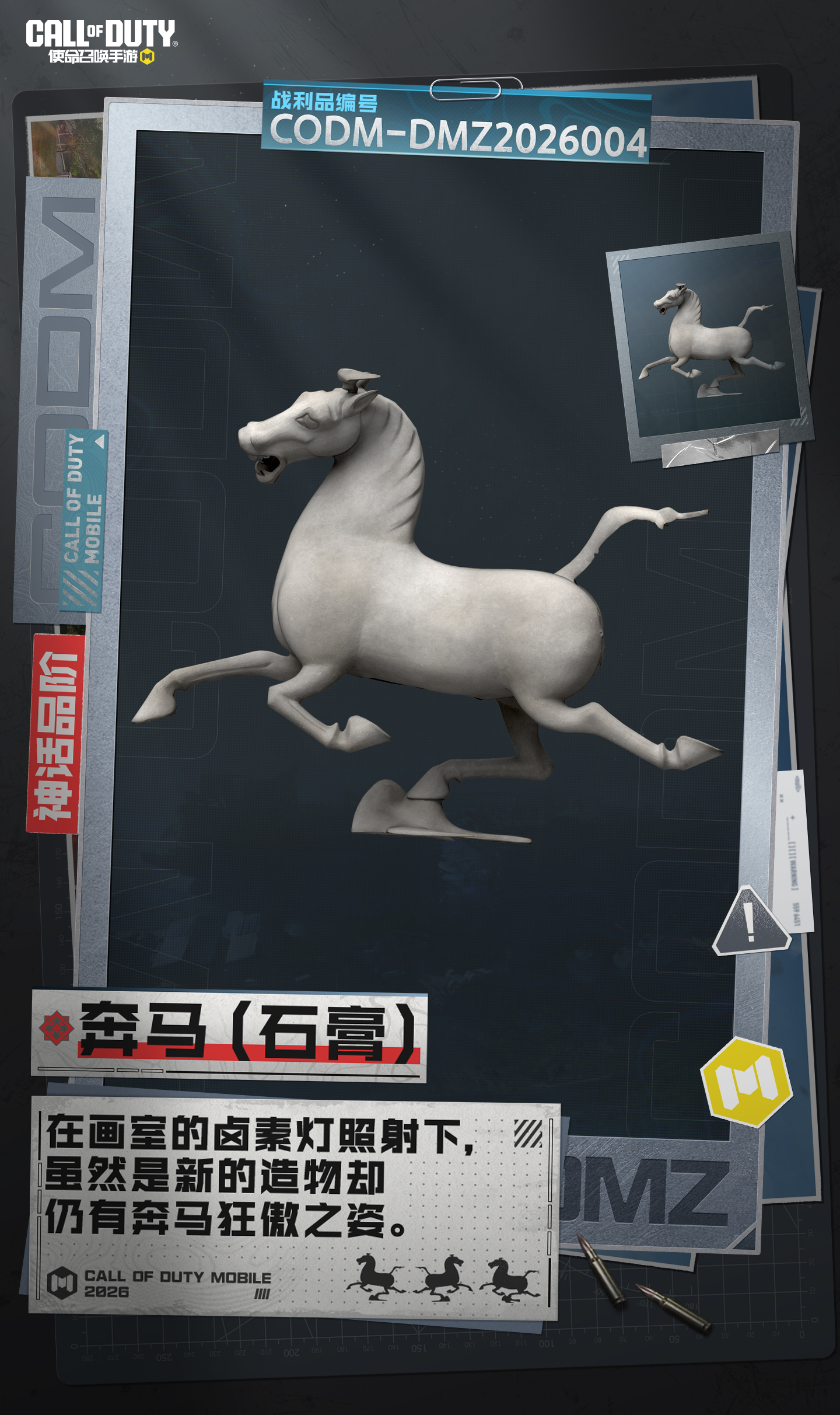 1月13日-3月16日,在DMZ: 禁区模式将有多匹骏马出没!战士们,快把它们收入背包,其中包含使命召唤手游X甘肃博物馆联动的究极品阶战利品【铜奔马】!哪位战士会拿下2026年的首个究极战利品呢?