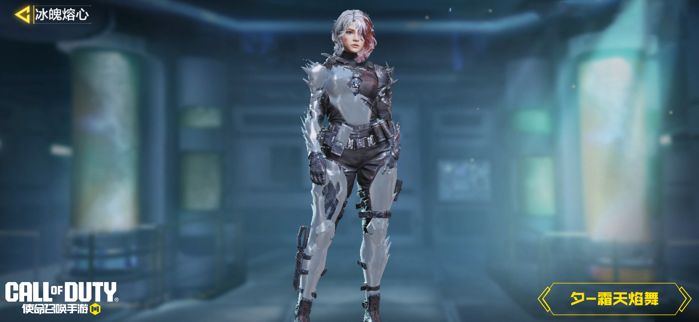 夕-霜天焰舞的头发一半是纯净的冰霜白,一半是热烈的焰火红,形成鲜明的视觉冲击。她的盔甲上凝结着冰刺,闪耀着寒冷的光芒。