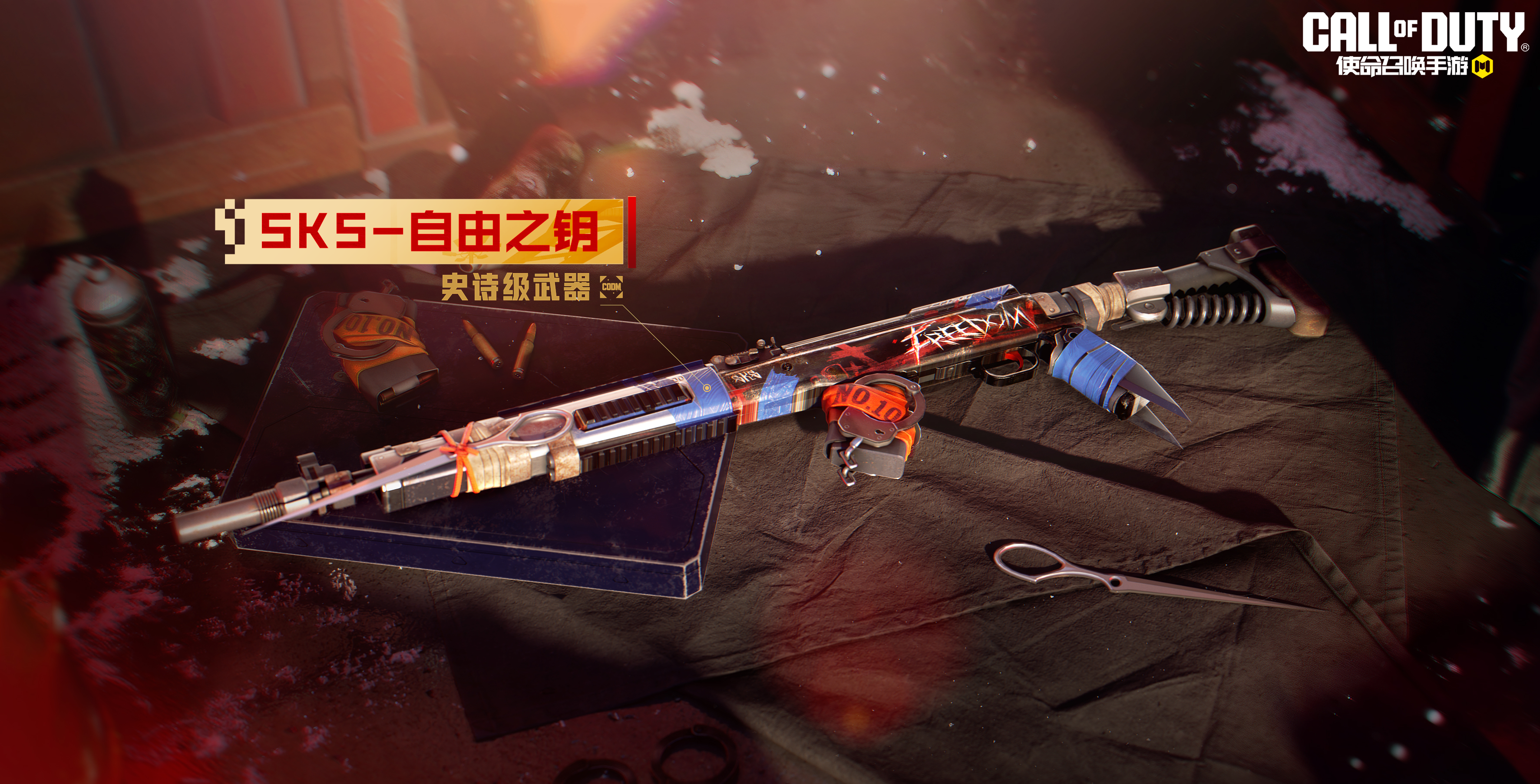 SKS-自由之钥红蓝交织的枪身铭刻FREEDOM,弹匣上绑缚的手铐与握把间缠绕的利刃,是枷锁亦是钥匙。