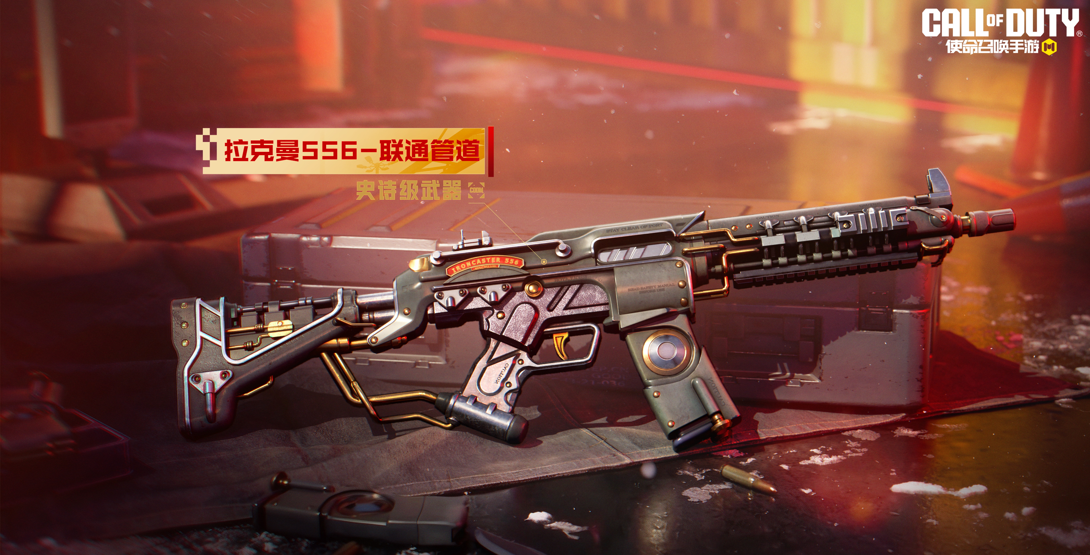拉克曼556-联通管道裸露的工业管道贯穿枪身,黑色金属泛着机油的光泽,粗犷外表下是精密无匹的火力输出。