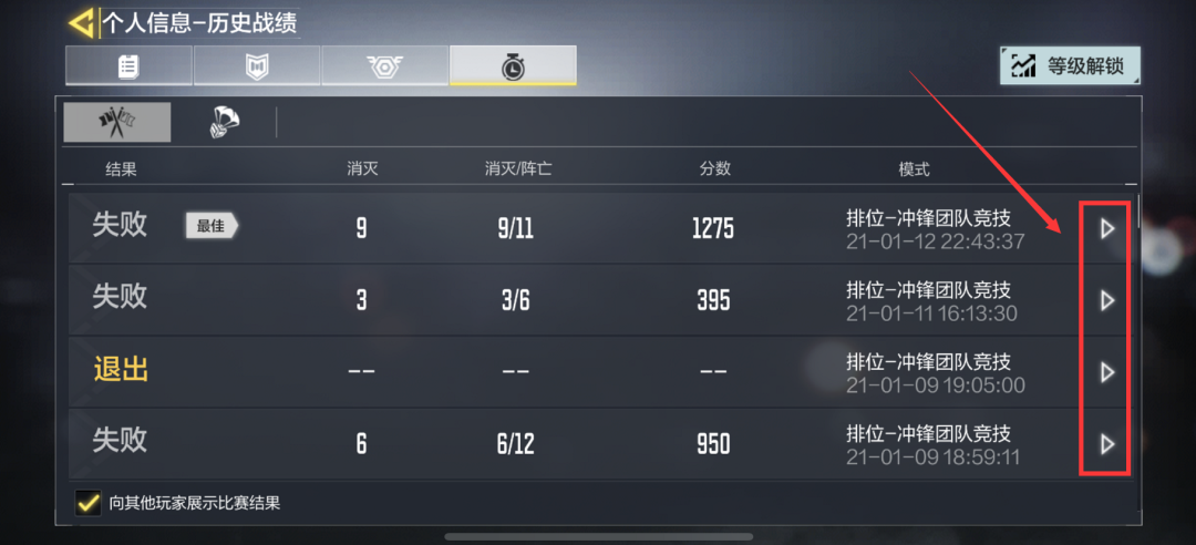 2、个人信息-历史战绩面板中查看对局详情后,点击举报按钮完成举报。