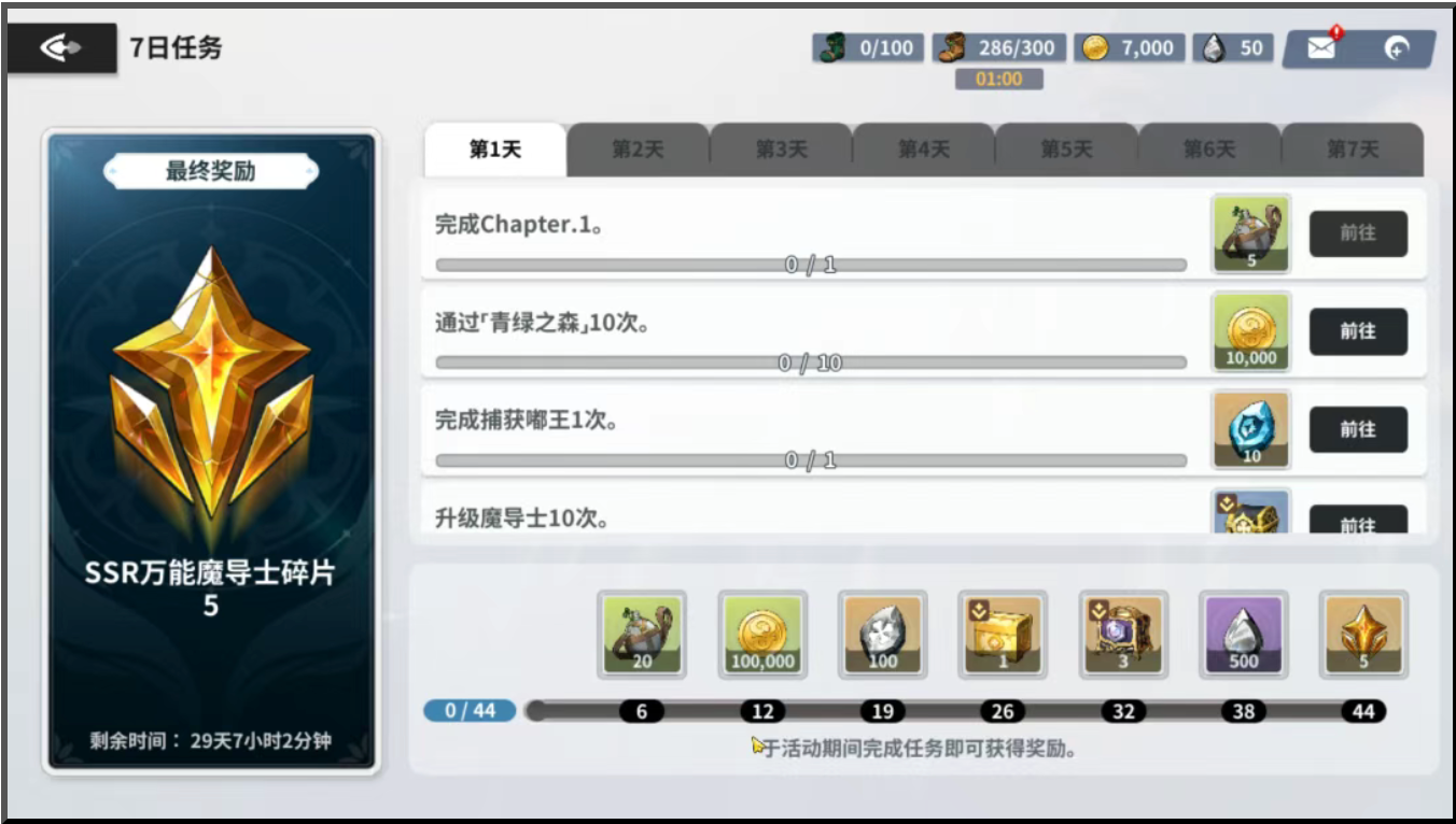 在「7日任务」里面给大家安排了丰厚的奖励,有黑水晶以及抽卡资源!达成最终目标,还可以获得5个「SSR万能碎片」!