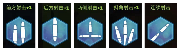 技能效果简单粗暴,直接就增加对应方向的子弹数量,通过这类技能直接就能形成密集的弹幕,在这类技能里面,性价比最高的就是【连续射击】,它可以跟其他几种子弹技能形成组合,各方向子弹都+1,遇到了就不要错过哦。