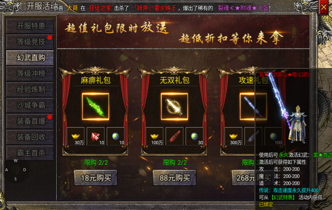 祭祀长廊三层、散人广场、封魔大殿、魔龙山谷