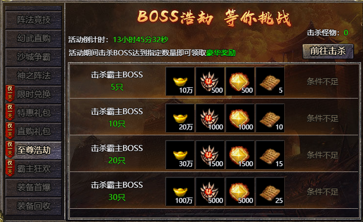 活动期间击杀boss达到指定数量即可领取豪华奖励