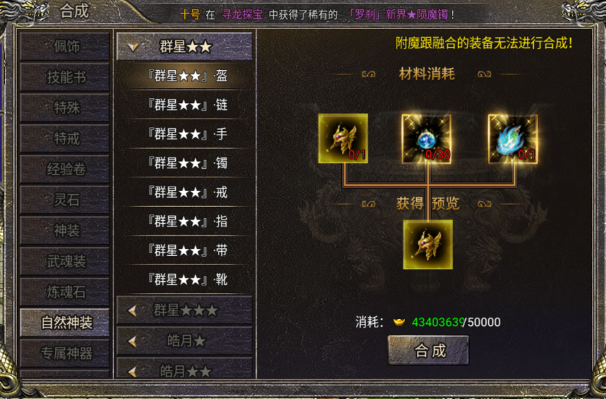 自然神装同时也是可以升级的,可以从【群星】升级到【皓月】,其中套装属性也会随之增加。升级除了之前BOSS击杀掉落的装备外,还需要自然碎片和自然精魄,二者分别是通过分解自然神装以及无间炼狱获得的哦!