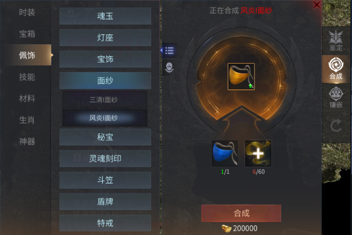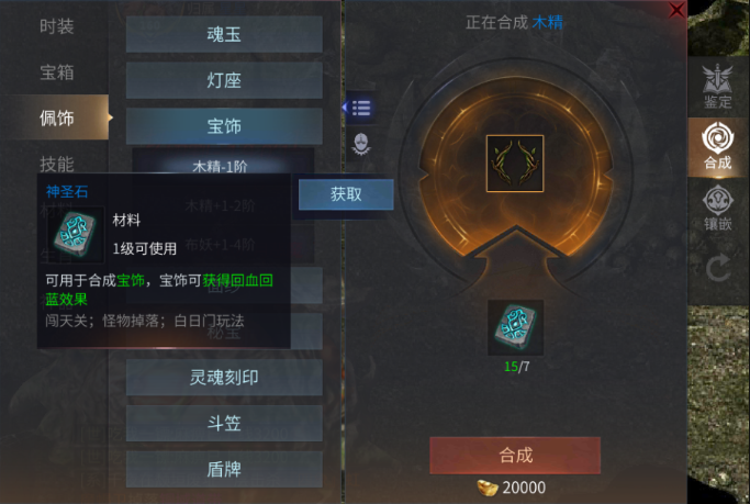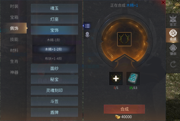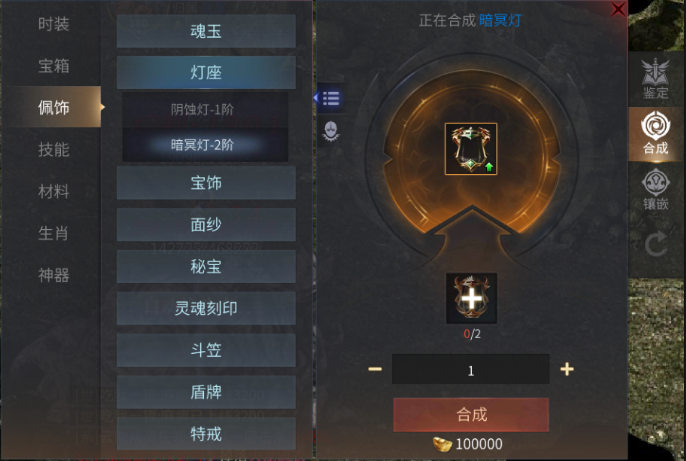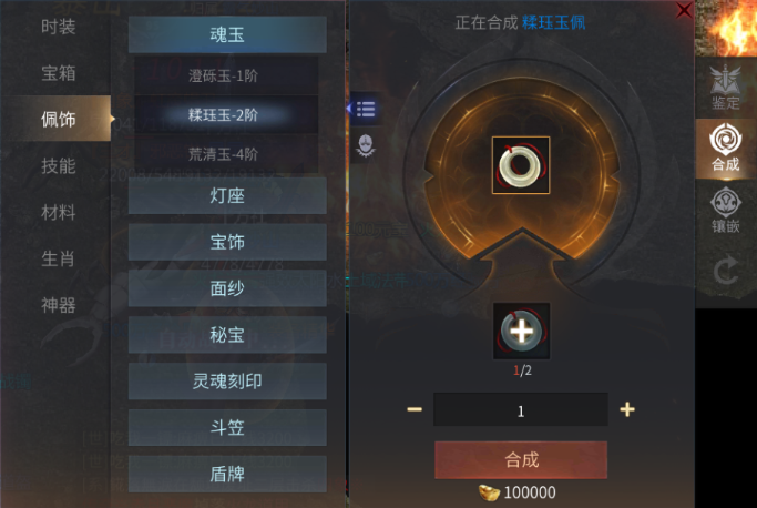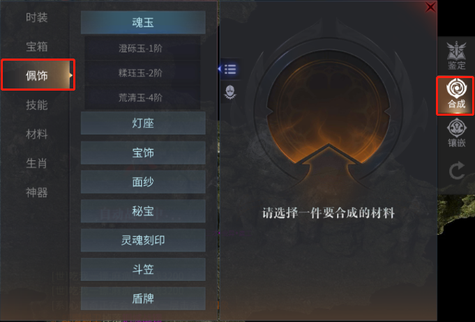 点击游戏右方“≡”键,打开“锻造”界面,点击佩饰即可进入佩饰合成及升级界面。今天我们主要介绍魂玉、灯座、宝饰和面纱。