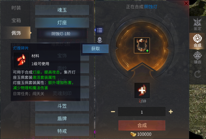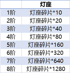 合成一阶灯座需要十个灯座碎片,升级二阶灯座则需要两个一阶灯座。