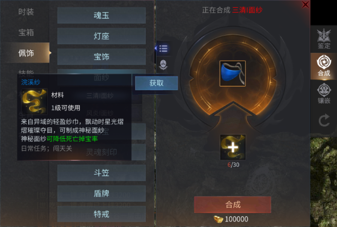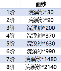 合成一阶面纱需要30个浣溪纱,此后每次升级都需要低阶面纱加更多的浣溪纱。浣溪纱可以通过日常任务和闯天关获得。