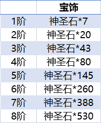 宝饰对血量有大量的提升,同时能够每秒回复一定的生命和蓝量,宝饰等级越高,每秒回复的生命和蓝量就越多。一阶宝饰可以使用10个神圣石合成,此后每次升级都需要低阶宝饰加更多的神圣石。神圣石可以通过闯天关、怪物掉落及白日门玩法获得。