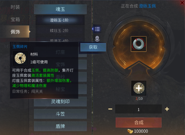 合成一阶魂玉需要十个玉佩碎片,升级二阶魂玉则需要两个一阶魂玉。