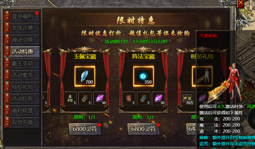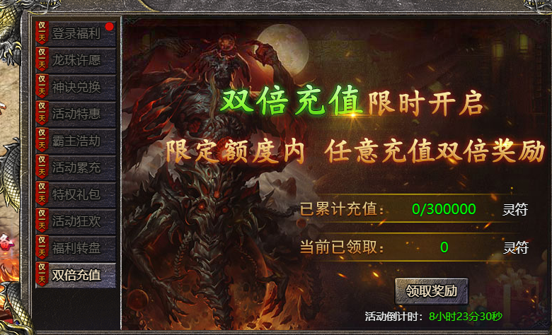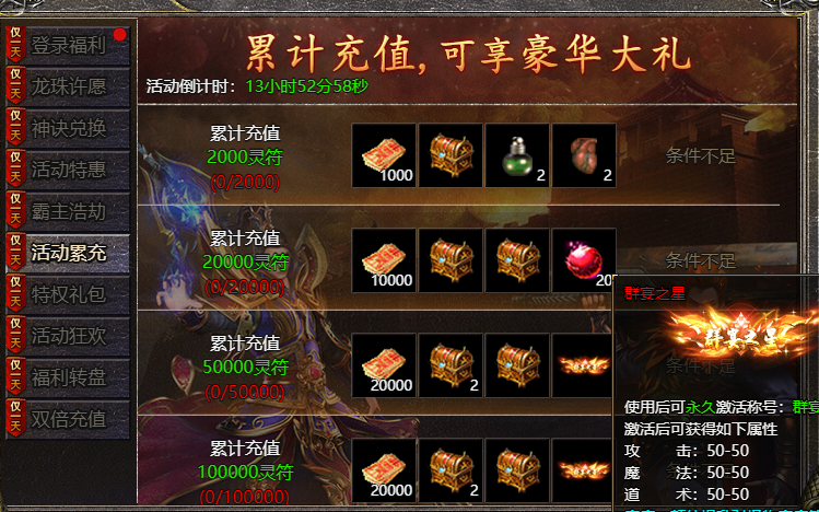 【活动内容】:活动期间,累计充值指定灵符,即可领取豪华奖励