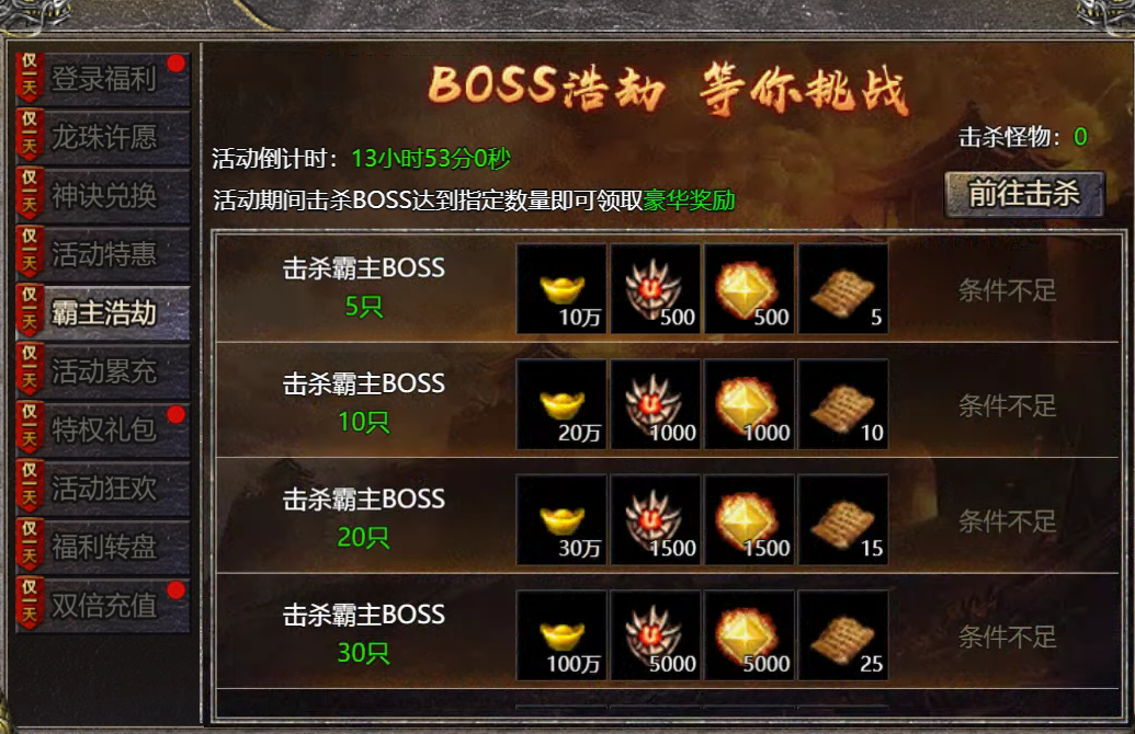 【活动内容】:活动期间,击杀BOSS达到指定数量即可领取豪华奖励