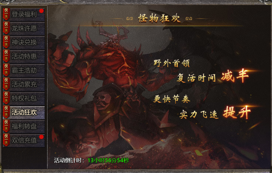 【活动内容】:活动期间,怪物狂欢,野外首领,复活时间减半