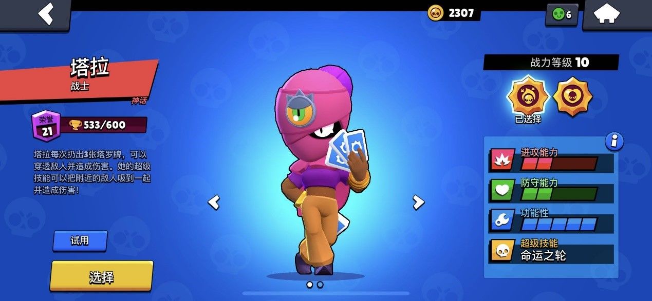塔拉是一名以控制见长的英雄。她的普通攻击能够穿透敌方目标并造成伤害。她的超级技能能够将技能范围内的所有敌人强制拉到一起,给敌人带来团灭危机!