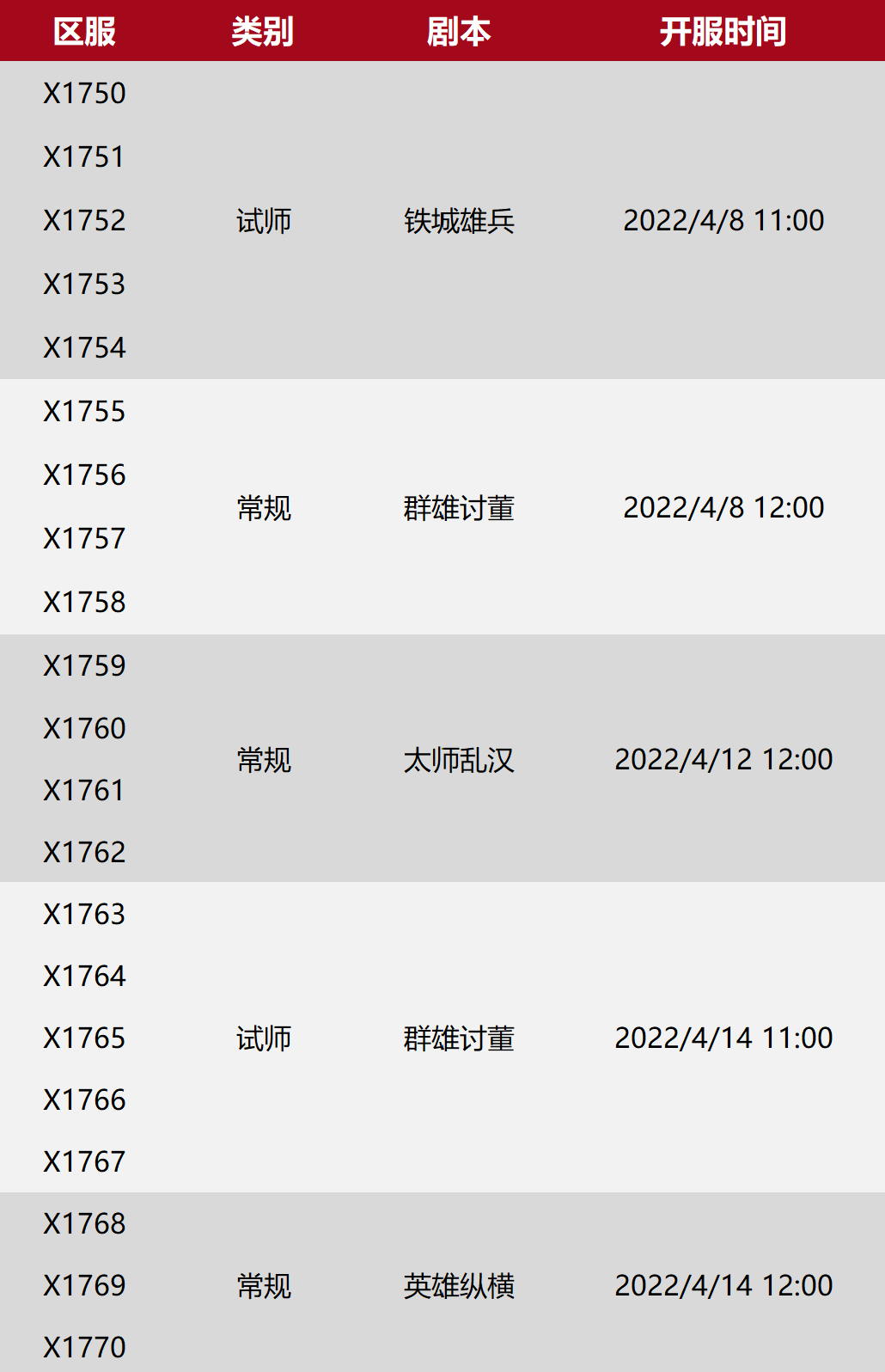 4月14日上午11点,X1763-X1767五个群雄讨董试师副本开启。