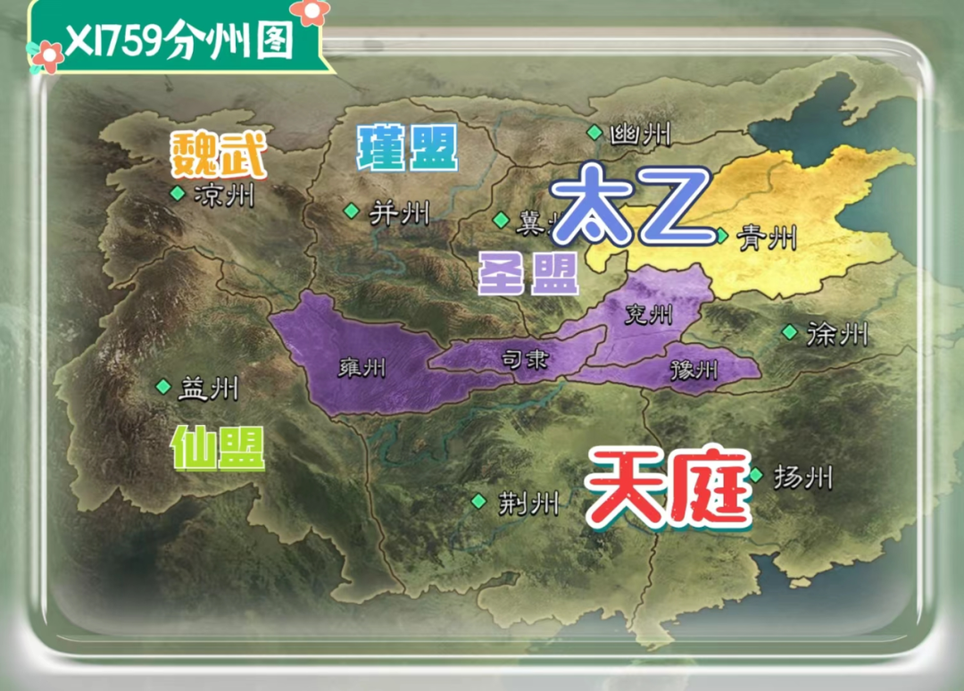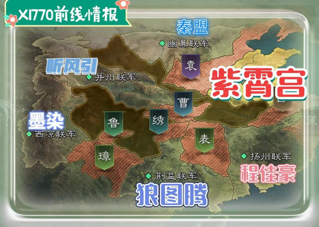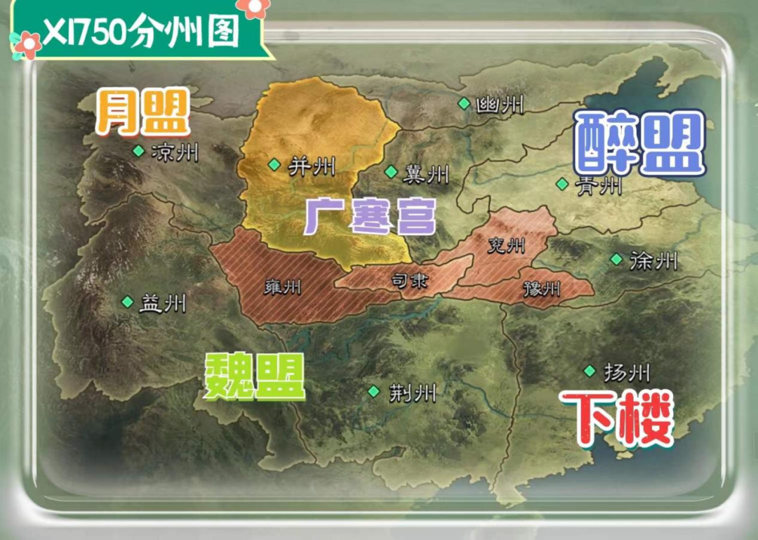 X1750前线情报:荆益【魏盟】最强,两主盟齐头并进,其内神威团表现卓越;青扬凉各有领头羊;【广寒宫】地盘也挺大,不过发育稍慢,正在追进度。