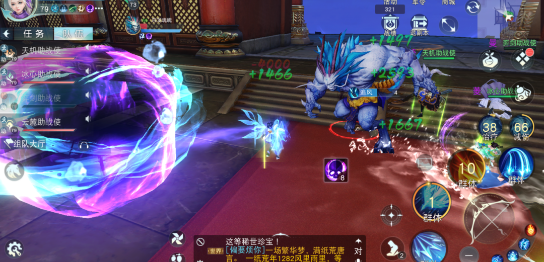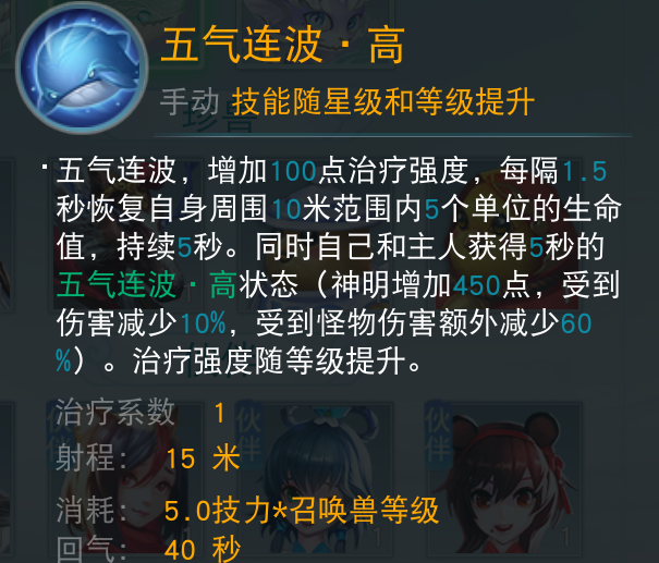专属手动技能【五气连波】,能增加治疗强度,持续四波的群体加血。更重要的是,还能提高主人的神明,同时给予其减伤buff。