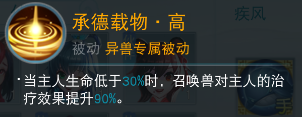 高级承德载物,能在主人生命低于30%时,将召唤兽对主人的治疗效果提升90%!哪怕是初级技能,也能在主人生命低于20%时给予50%的治疗效果提升。