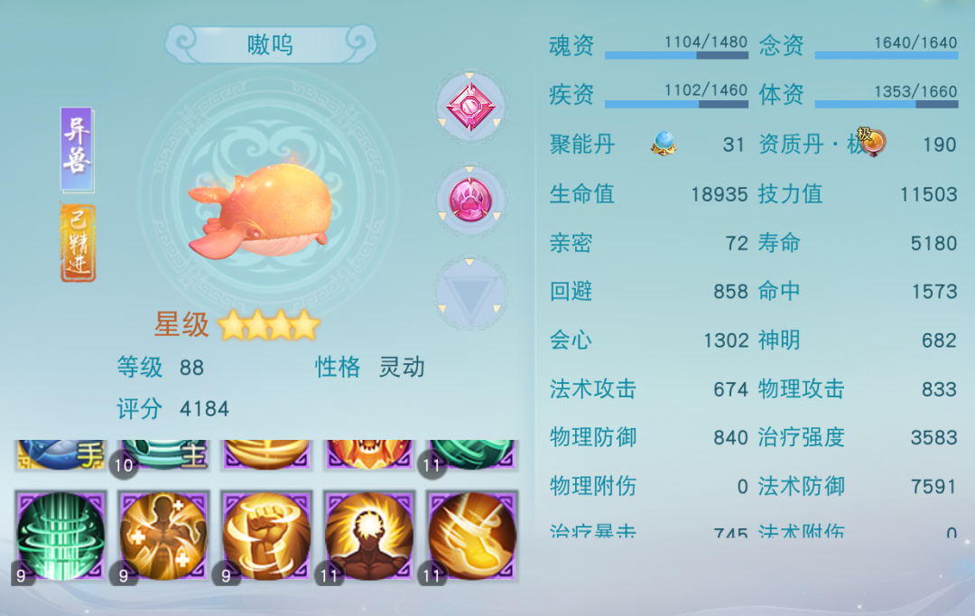 除了资质,灵鲲的初始技能也都很适合治疗型宝宝用。