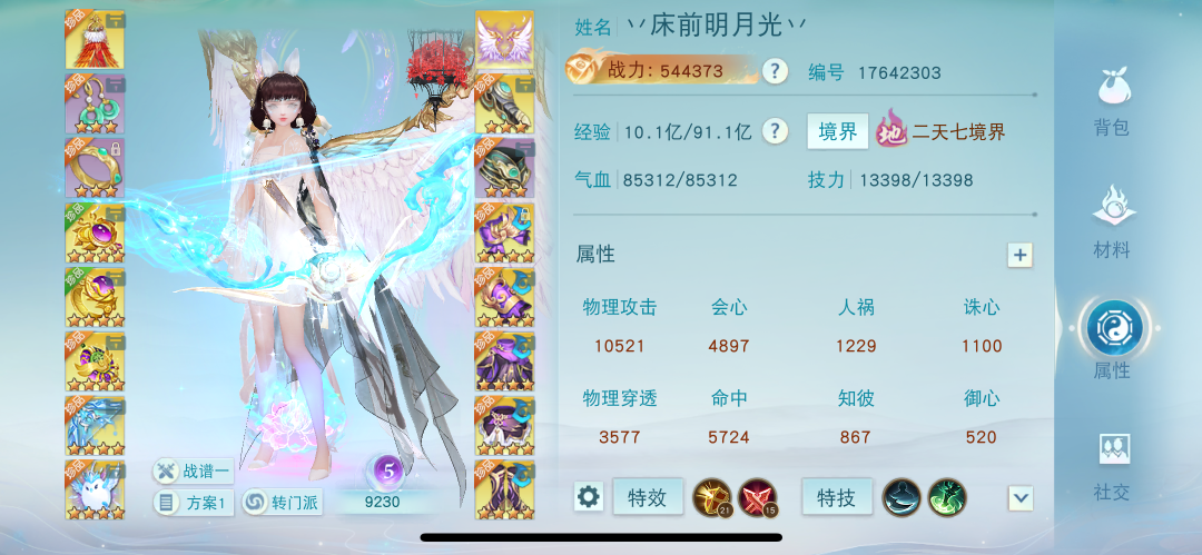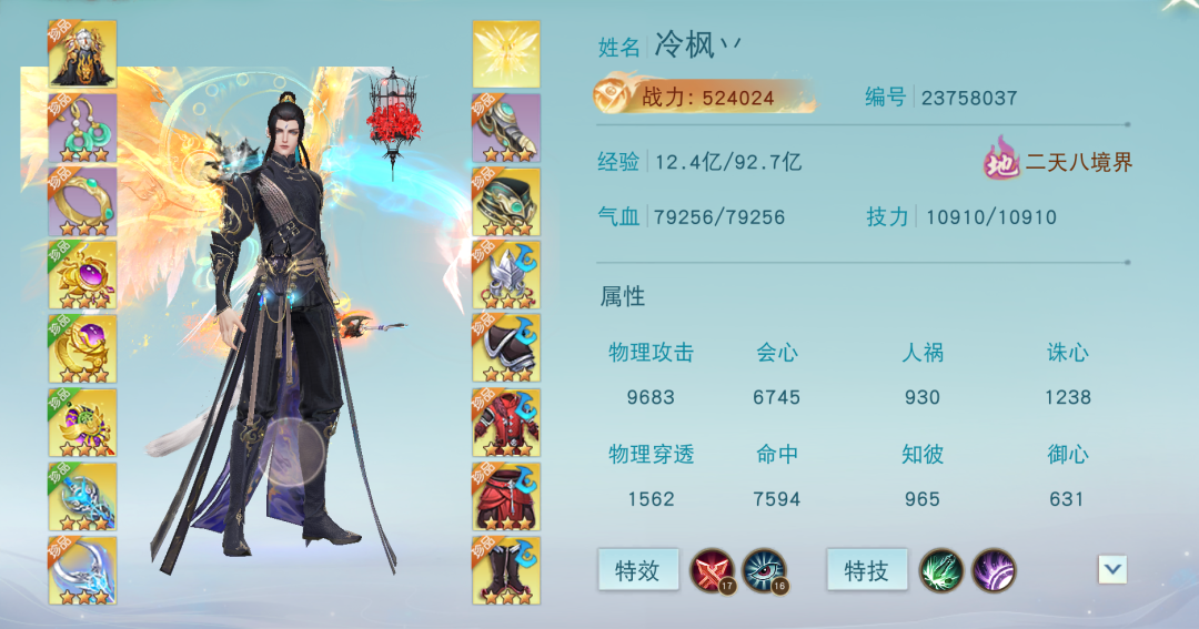 冷枫丷的属性面板也很厉害,是我们念念区第三的弈剑。9683点的物理攻击搭配上2168点双高,并在6745点会心的加持上,使得他在敌军中七进七出,无人可挡!