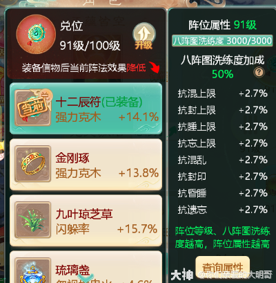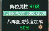 举例账号:相聚长安服务器,玩家笙笙,八阵图等级91级,洗练总次数超过了3000次,获得了50%的总体加成。