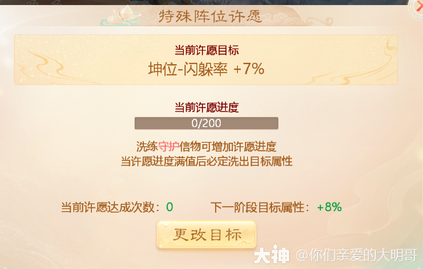 可选择乾、坤、震三个阵位中的一个阵位,并选择任意一个属性类型作为许愿目标,许愿后洗练信物可增加许愿进度,许愿进度满值后必定洗出许愿阵位的目标属性。