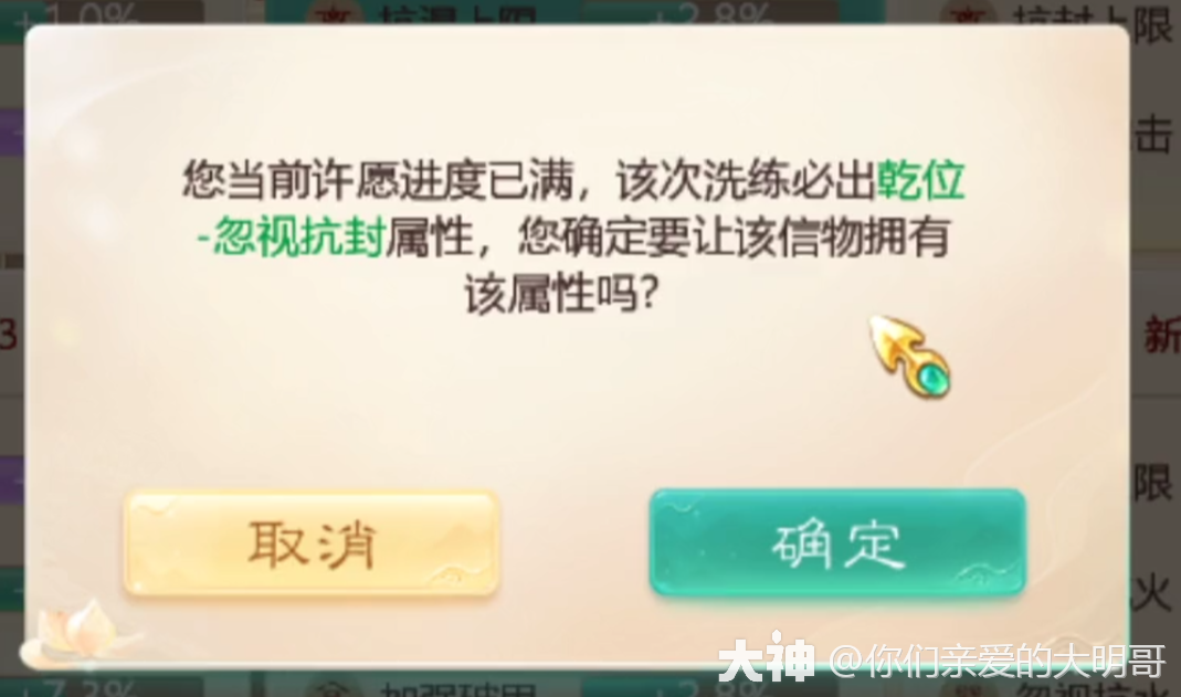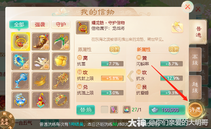 当许愿值满了以后会出现二次确认,可以选择强袭或守护信物进行洗练,这样就必定得到该属性。之后再洗练,许愿进度归0、达成次数+1,进入下一阶段。