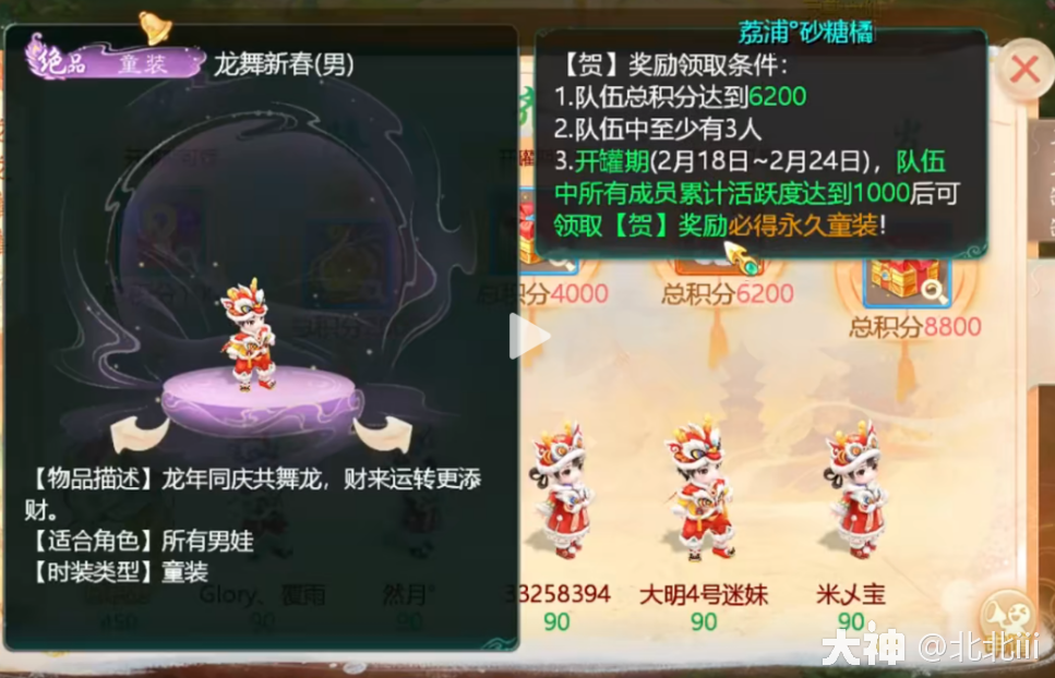 看似好像有些复杂、但实际上很简单,1和2基本就是一个要求,3的话只要2天满活跃就可以完成了。具体操作如下:首先你组建一个存罐小队,所有人把银罐罐存满,也就是每人2000万银两,其中每存入5万两银两就是3积分,换算一下就是每人1200分,5个人加起来1亿银两就是6000分。这里基本上就完成得差不多了。要领孩子时装不是需要6200分吗,那还剩下的200分就从金罐罐这里存金元宝,金元宝是每消费40仙玉或交易点数会给1个,换算一下也就是最多消费100块钱可以免费获得。你可以自己5开,每个号平摊20块钱,也可以找个大腿当挂架直接让大佬氪100块钱,直接白嫖岂不美哉?