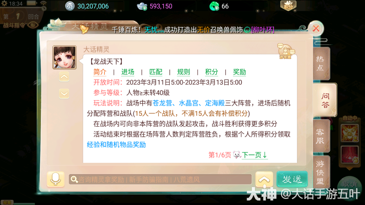 龙战天下:单人PK匹配,阵容随机,输的快起来是真的快,两场战斗失败就离场,如果匹配到大佬队伍,战斗到最后都未尝不可。而且不意为这你输,阵营就会失败。所获得的龙战积分可以兑换好多积分,如果得到龙王的青睐,还可能会得到 神兵,一级五行等特殊奖励。龙战的奖励一定要及时领取,第二天只会补发经验,千万不要错过了 几率吖