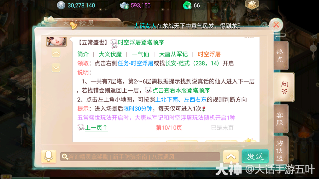 时空浮屠:这个可以理解为爬塔寻宝了。登塔顺序 一般帮里都会通知,直接问大话精灵也可以。也是很简单的了