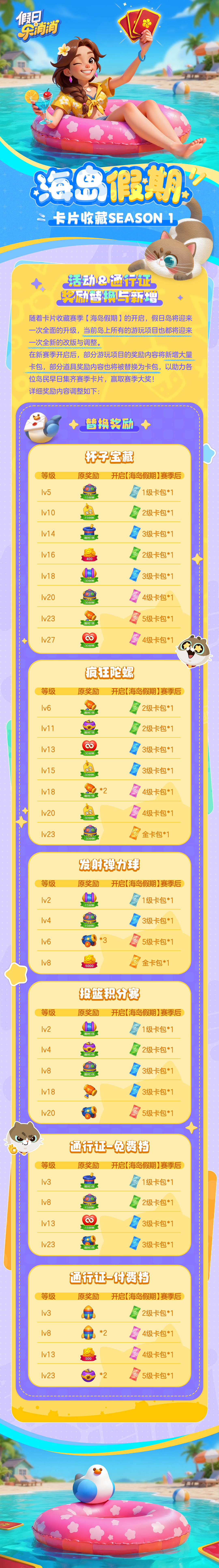 随着卡片收藏赛季【海岛假期】的开启,假日岛将迎来一次全面的升级,当前岛上所有的游玩项目也都将迎来一次全新的改版与调整。在新赛季开启后,部分游玩项目的奖励内容将新增大量卡包,部分道具奖励内容也将被替换为卡包,以助力各位岛民早日集齐赛季卡片,赢取赛季大奖!