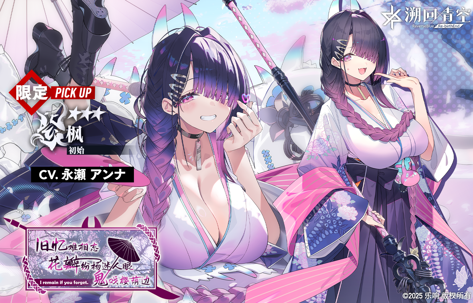 「欲掩心潮涌 绯霞悄染玉颜中 戏意弄芳华」和「旧忆难相忘 花瓣纷扬迷人眼 鬼戏樱荫边」