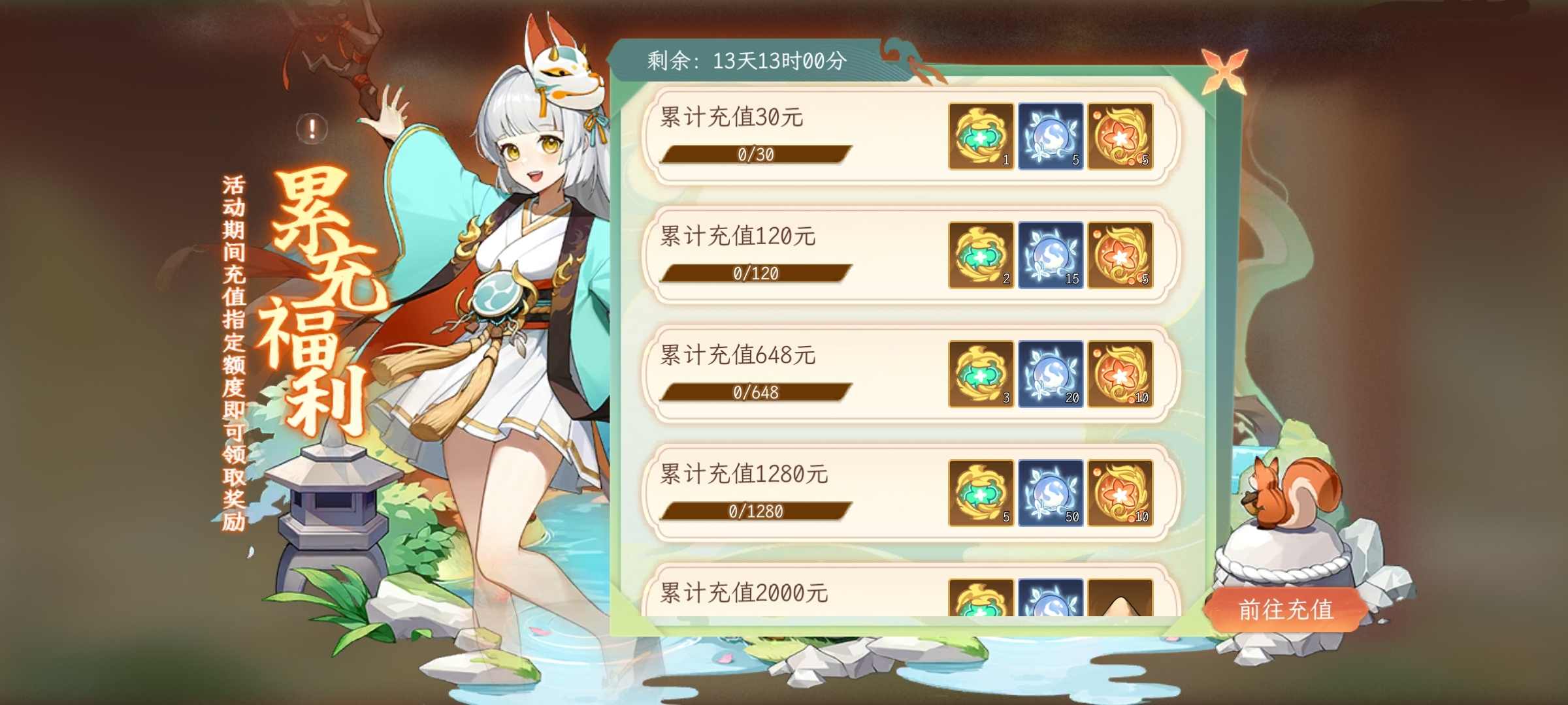 活动内容:活动期间,累计充值金额达到指定数量可以领取充值奖励。