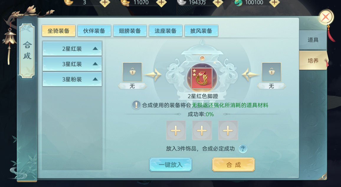 坐骑装备、伙伴装备、翅膀装备、法座装备、披风装备皆是三件饰品合成(100%)。