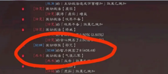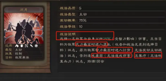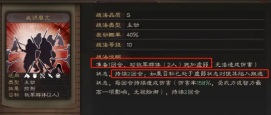九变+示敌以弱自然是因为其自带战法和缘故配合它的的主动战法闭月,25%分担伤害,在配合示敌以弱的减伤,战法搭配威谋靡亢+刮骨疗毒,配合主战法就当为敌军武力最高时进入混乱状态,若为敌军智力最高时进入计穷状态。在配合再配合威谋,完美配合,非常恐怖。