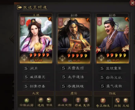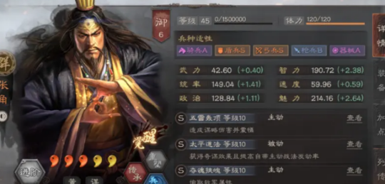 作为阵容的输出点,太平道法+夺魂挟魄打高爆发,我们兵书选择疾战突围加将威加鬼谋。让张角发动主动战法配合疾战突围,在配合鬼谋提高伤害,要是张角演,咱们选择带的将威,提高发动几率。疾战突围受到伤害降低,让张角又减伤有又较高的伤害!