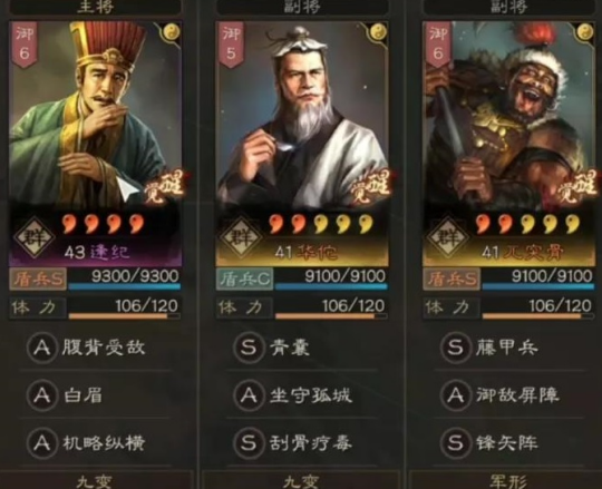 然后副将兀突骨战法携带御敌屏障,变种的藤甲兵减伤体系就是藤甲兵再加一个别的减伤战法。锋矢阵也是为了提高逄纪的输出。另一个副将选择的华佗,那么之所以选择华佗很重要的一个原因就是逄纪的统率太低了,选择华佗能够利用其自带战法提升逄纪的统率(战斗前4回合我军群体2人提高40统率)。而且华佗的治疗续航也是非常给力的。另外对比一下左慈这个武将,选择左慈也不是不可以,但是对比起来看,左慈的加血能力以及统率提升方面就远远不如华佗来的更实在一些。携带战法选择了双奶,坐守孤城+刮骨疗毒,也可以换成整装待发。