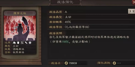 腹背受敌:全兵种适性,A级战法,45%概率瞬发战法。战法描述非常的简单,自己以及敌军谋略属性最高的武将同时对敌军单体造成谋略攻击(118%)。举个例子,如果这个阵容打桃园,逄纪发动了腹背受敌,选择了张飞作为施放目标。那么正常情况下就是逄纪和对面智力属性最高的刘备对张飞发动一次谋略攻击。换句话说就是这个武将的战功并不会很高,因为他的一半伤害是敌军对敌军造成的伤害,这种模式有点类似于貂蝉的分伤模式。所以总体从这个队伍上来看,逄纪这个武将,无论走藤甲也好,还是走什么别的阵容也好,他喜欢的是对面阵容里面有“智力差”,这样他能打出一个比较理想的效果。那比如对面如果是蜀弓这种阵容,智力都非常高,那这样来看逄纪的二段伤害(敌军智力最高对敌军的伤害),就可能打不出什么伤害来。
