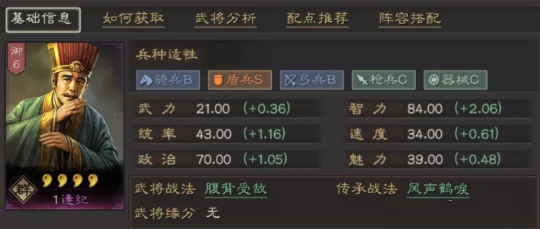 那么我们来简单看一下逄纪这张卡牌的属性和兵种适性。盾兵S,其他的都没法看。三维属性,统率43(+1.16)基础和成长可以说是非常的差,智力84(+2.06)对于一张紫卡来说是非常不错的了,速度是龟速就不必多说。