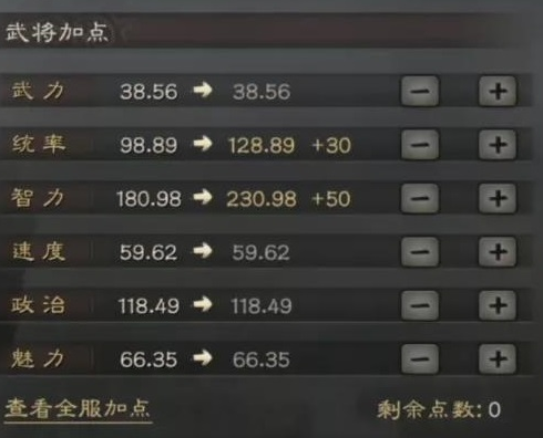 那么接下来我们来看看这个队伍的搭配机制。首先我们组藤甲队肯定是为了对抗对面的兵刃队伍。对抗兵刃队伍主要看统率这个属性,那么逄纪的统率这么低我们怎么解决这个问题呢?那么首先我们在加点的时候可以加一些统率点数。截图属性里面加了30点统率,在早期的时候甚至加了50点统率点,但是后来发现统率加高了这个队伍的伤害就不太够了,所以又改了改这个属性加点方案。