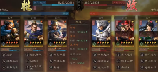 而夏侯惇主打反击,他的自带战法刚烈不屈与气凌三军,都是受到伤害时对敌军造成反击伤害,所以我们带魅惑的原因就是利用反击打出高额伤害,而且夏侯如果不带盾S宝物,队伍实力下降不多,这队有时候靠许褚,有时候靠夏侯,双核都能造成伤害!