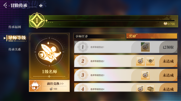 消耗心得提升 「名师等级」,解锁大量等级奖励与 「传承积分」