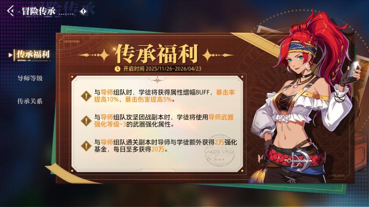 与导师通关副本,双方额外获得强化基金,助力装备强化