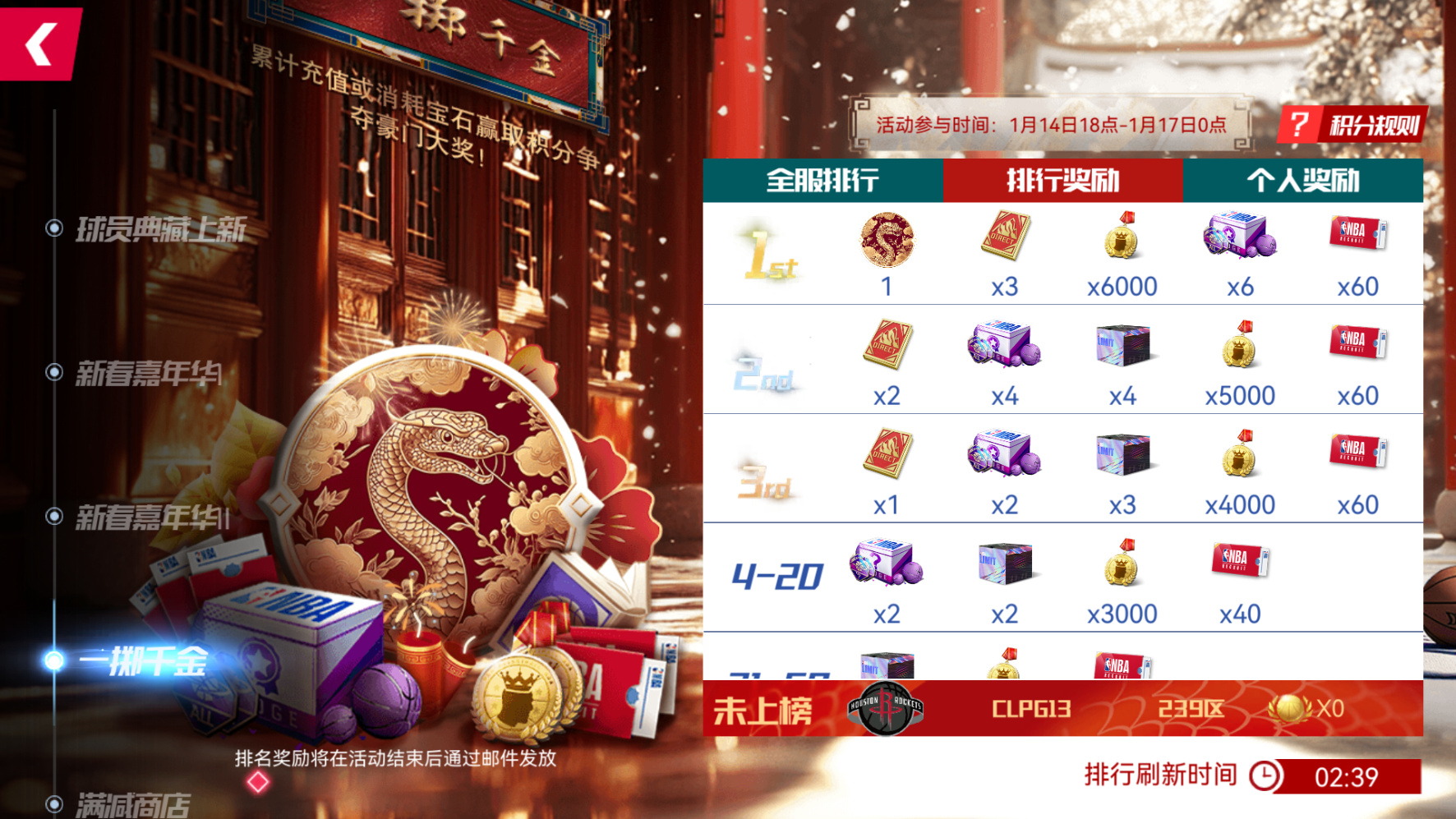 积分全服第一,可获取金蛇狂舞动态头像、默契定向书、四星徽章自选礼盒等稀有道具!