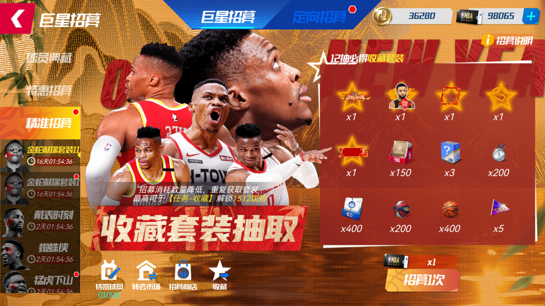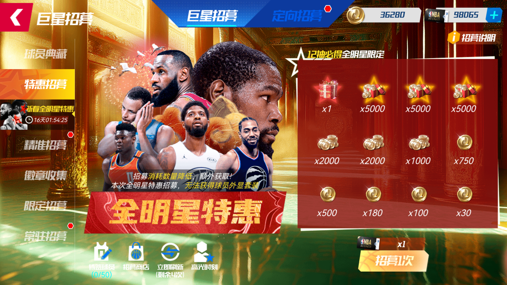 活动期间,可使用【精准招募函】在【新春全明星特惠自选卡池】池中,招募任意一位全明星球员(除姚明外)。