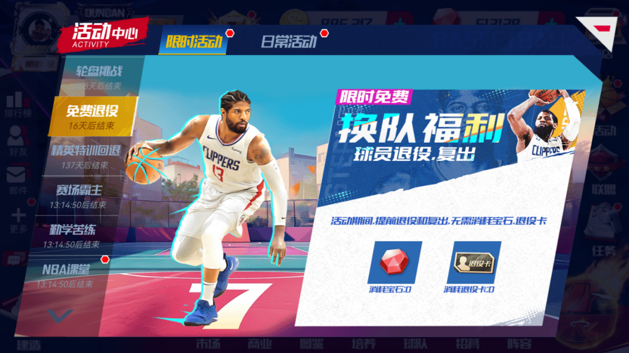 免费退役和复出开启,活动期间,退役和复出无需宝石和退役卡,换队无压力。