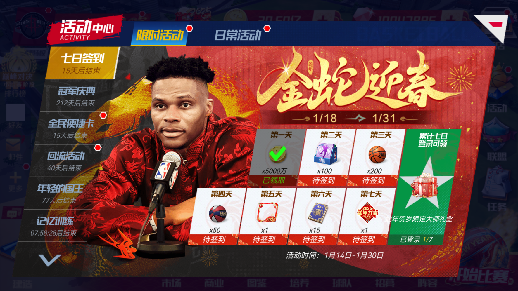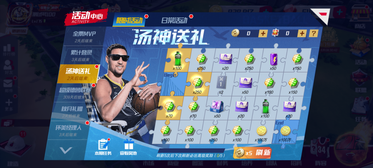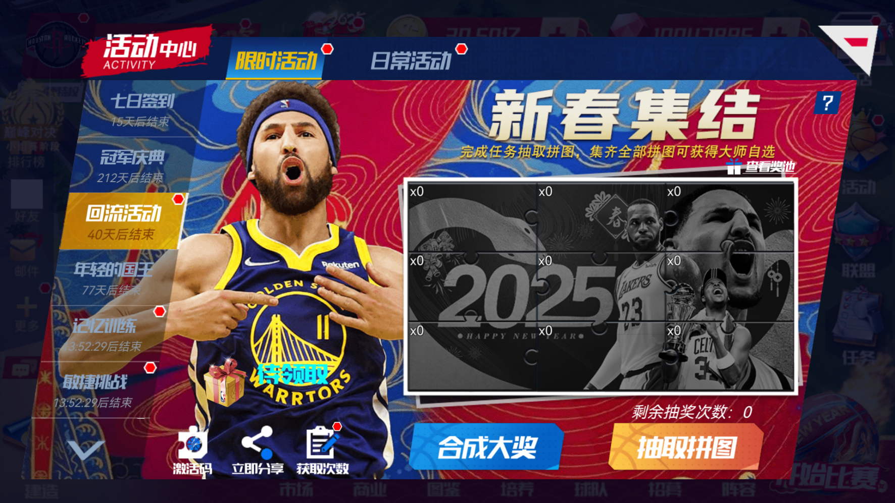 篮球大师新春集结!游戏内完成限时任务即可获得抽奖次数,有机会抽到巨星拼图,凑齐全部巨星拼图后,即可合成大奖,领取SS+球员自选!